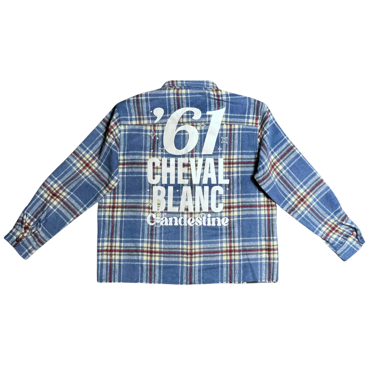 100% cotton faded flannel with rawcut hem. Front button closure, buttoned cuffs, and chest pocket. White Clandestine logo on front pocket and white '61 Cheval Blanc jumbo print on back.